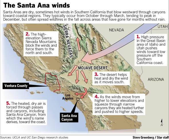 These maps indicate that no logical north-south divisions stand out providing a quick way to divide the state, even though most historical efforts tried to use horizontal lines along latitude numbers such as 36 degrees. While a simple approach, it isn't too logical to use horizontal lines. The watersheds and bioregions are a result of topographical features and climate. Consider a topographical map of California: ![]() The first thing one observes from these three maps is that a "Southern California" seems to be identifiable. One might argue that the South Coast would seem to be different from the inland. There is some truth in that. But one can even demonstrate an odd tie between the two - the infamous Santa Ana winds: ![]() One can't help but feel that Southern California is reasonably identifiable as a physically separate area from the rest of the State. The line to be drawn is not literally east-west or north-south. But some relationship probably exists between the physical and existing political boundaries. What about the rest of the state? Again, in the past some have attempted to simply use a latitude number, a simple east-west line. But as the physical maps above indicate, particularly if one looks at the bioregions and watershed maps, an obvious fact stands out. The remaining portion of California has a coastal area more or less split off from the east by mountains. Further, when we review the political maps such as the 2000 Presidential election county results, we begin to see an area with an orientation: ![]() The fact is a political divide does exist. In their San Francisco Chronicle column of November 1, 2004, Matier and Ross reported on some results by the Field Poll: